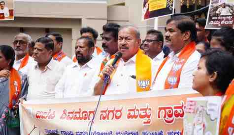 ಶಿವಮೊಗ್ಗ : ಭ್ರಷ್ಟಾಚಾರದಲ್ಲಿ ಮುಳುಗಿರುವ ಕಾಂಗ್ರೆಸ್ ಸರ್ಕಾರ ಶೇ.85 ರಷ್ಟು ಲೂಟಿ ಮಾಡಿದ್ದೂ ಅಲ್ಲದೆ, ಪ್ರಜಾಪ್ರಭುತ್ವವನ್ನು ಕಗ್ಗೊಲೆ ಮಾಡುತ್ತಿದೆ ಎಂದು ಶಿವಮೊಗ್ಗ ನಗರ ಶಾಸಕ ಎಸ್.ಎನ್.ಚನ್ನಬಸಪ್ಪ ಆರೋಪಿಸಿದರು. ರಾಜೀವ್ಗಾಂಧಿ ಯೋಜನೆಯ ವಸತಿ ಮನೆಗಳ ಹಗರಣ ಹಾಗೂ ಮುಸಲ್ಮಾನರಿಗೆ ಮಿತಿಮೀರಿದ ಮೀಸಲಾತಿ ಕೊಡುತ್ತಿರುವ