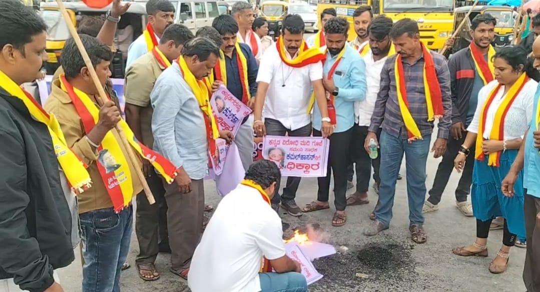 ಶಿವಮೊಗ್ಗ : ತಮಿಳಿನಿಂದ ಕನ್ನಡ ಹುಟ್ಟಿದೆ ಎಂದು ನಟ ಕಮಲಹಾಸನ್ ಹೇಳಿಕೆಗೆ ಕರ್ನಾಟಕ ರಕ್ಷಣಾ ವೇದಿಕೆ ಸ್ವಾಭಿಮಾನಿ ಬಣದಿಂದ ಕಮಲಹಾಸನ್ ಪ್ರತಿ ಕೃತಿ ದಹಿಸಿ ನಗರದ ಬಸ್ ನಿಲ್ದಾಣದ ಅಶೋಕ ವೃತ್ತದ ಬಳಿ ಕರವೇ ಸ್ವಾಭಿಮಾನಿ ಬಣದ ಜಿಲ್ಲಾಧ್ಯಕ್ಷ ಕಿರಣ್ ಕುಮಾರ್.ಹೆಚ್.ಎಸ್